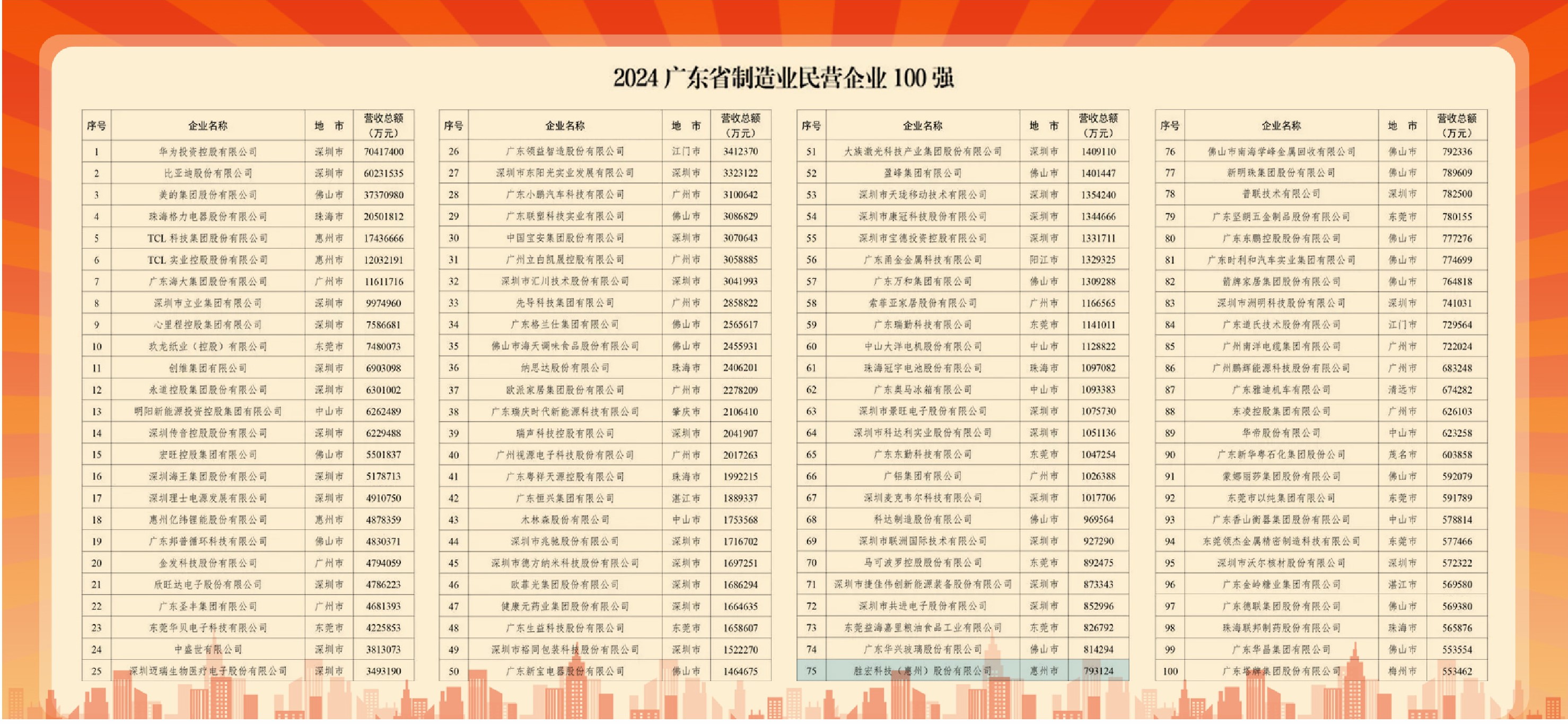民营经济是推进中国式现代化的生力军,是高质量发展的重要基础。在广东,民营经济以仅占全省50%左右的地区生产总值,贡献了70%以上的技术创新成果。10月29日,“2024广东省民营企业100强”系列榜单发布会暨优强民企助力“百千万工程”湛江招商推介会在湛江举行。会上,“2024广东省民营企业100强”“2024广东省制造业民营企业100强”“2024广东省服务业民营企业50强”三个榜单正式发布。我司凭借优越的综合实力在2024广东省制造业民营企业100强榜单中位列第75名。