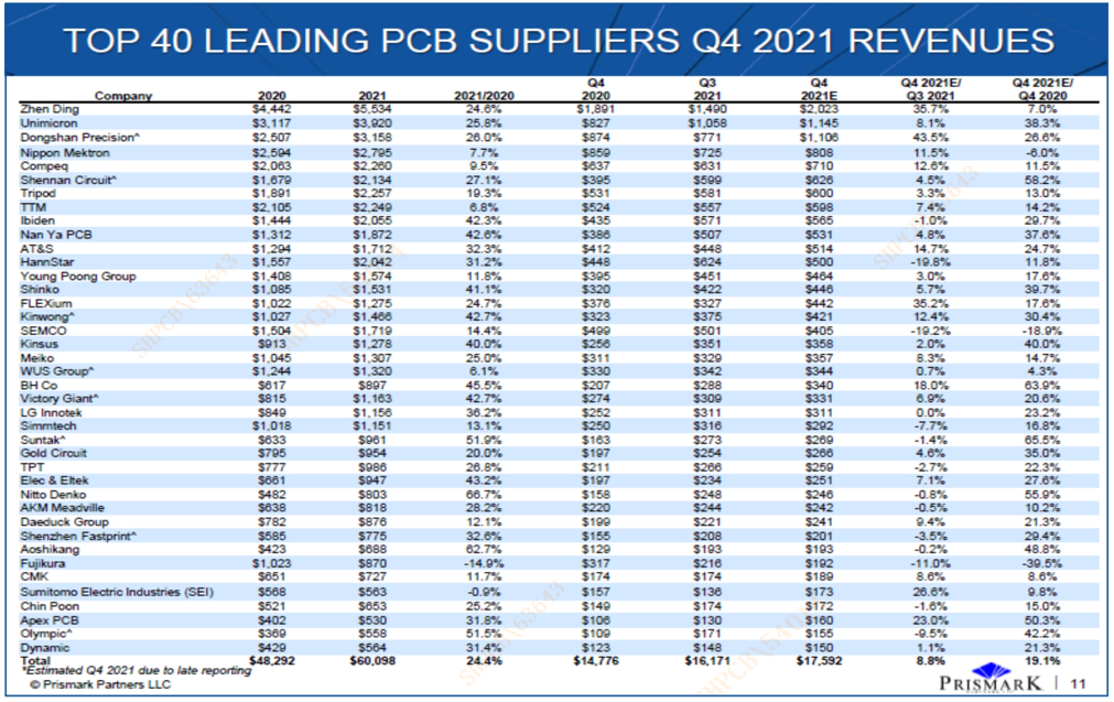 近期,国际知名电子行业咨询集团Prismark Partners发布2021年第四季度全球40强PCB企业排行榜与数据分析报告,共有七家内资企业上榜。其中,jiuyou.com九游科技在2021年第四季度全球PCB企业四十强排行榜中位列第22名,在内资PCB企业中位列第4名。